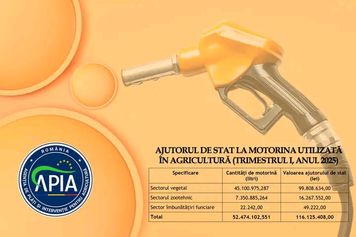 Agenția de Plăți și Intervenție pentru Agricultură (APIA) anunță efectuarea plăților aferente ajutorului de stat pentru motorina utilizată în agricultură în perioada 1 ianuarie – 31 martie 2025. Suma totală alocată fermierilor pentru acest interval depășește 116 milioane de lei, iar sprijinul este acordat în conformitate cu prevederile HG nr. 1174/2014 și ale Ordinului MADR nr. 269/2025, cu modificările și completările ulterioare.