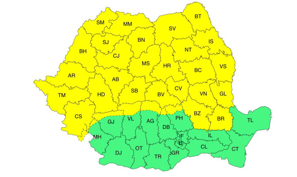 Sâmbătă vor fi ploi, descărcări electrice, vijelii și izolat grindină în jumătatea de nord a teritoriului. Din noaptea de sâmbătă spre duminică, vremea se va răci accentuat, iar ploile se vor extinde și se vor transforma treptat în lapoviță și ninsoare, la început la munte, apoi și în zonele joase de relief. Îndeosebi în zona montană și submontană se va depune strat de zăpadă, în medie de 10…15 cm.