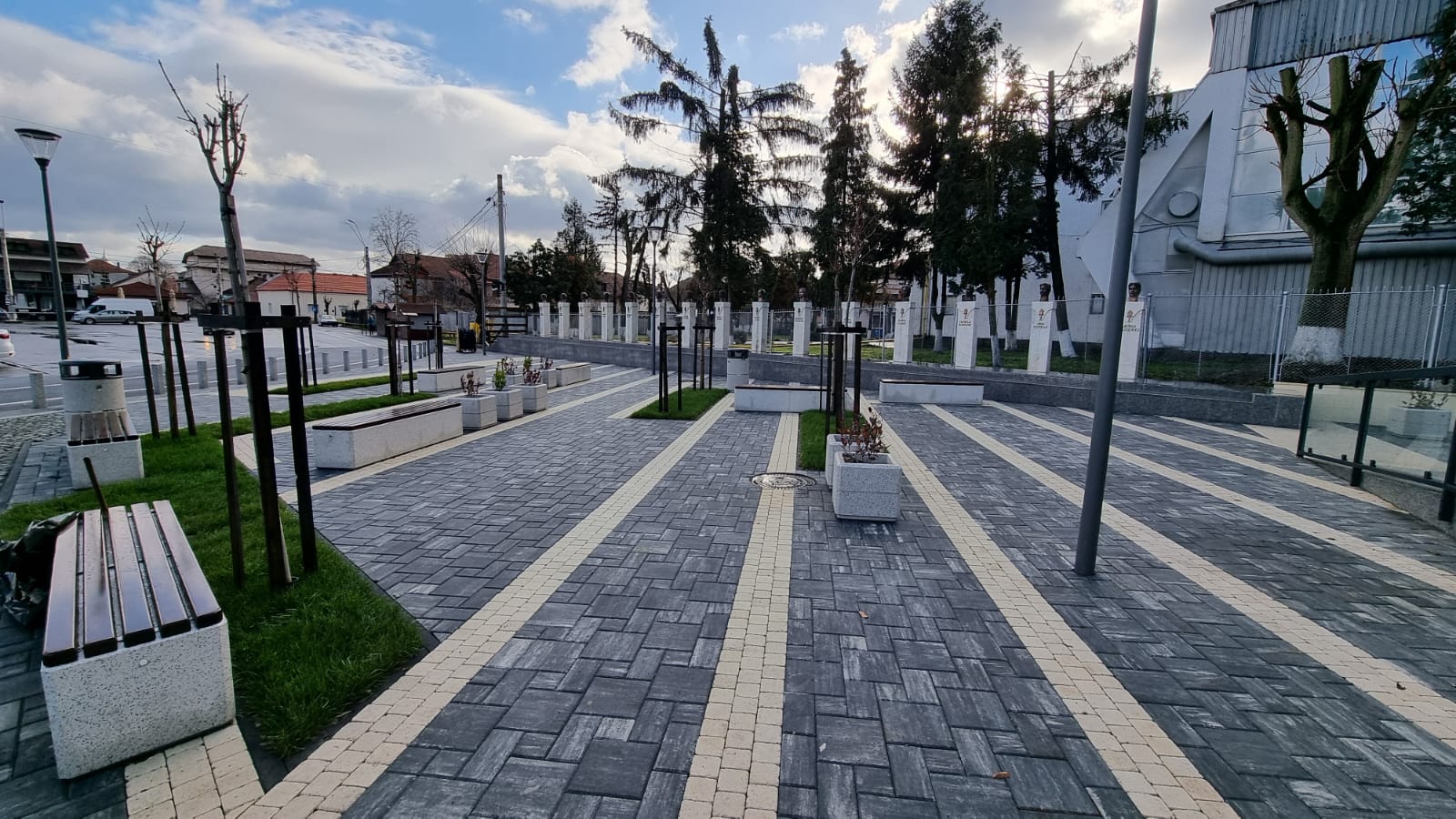 În zona de așteptare au fost montate bănci, coșuri de gunoi, a fost realizat iluminatul exterior cu led, au fost plantați copaci ornamentali și rondouri pentru flori. De asemenea, a fost iluminat arhitectural grupul statuar al gimnastelor.
