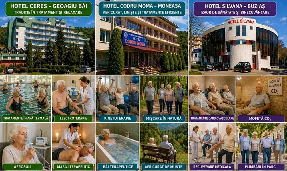 Pentru începutul sezonului de tratament din 2026, sunt disponibile prin Casa Județeană de Pensii Hunedoara, locuri în mai multe stațiuni balneare recunoscute pentru eficiența terapiilor și condițiile de recuperare medicală. Seria 1, cu plecare în perioada 27–30 aprilie 2026, oferă încă bilete în centre cu profil terapeutic din Geoagiu, Buziaș și Moneasa.