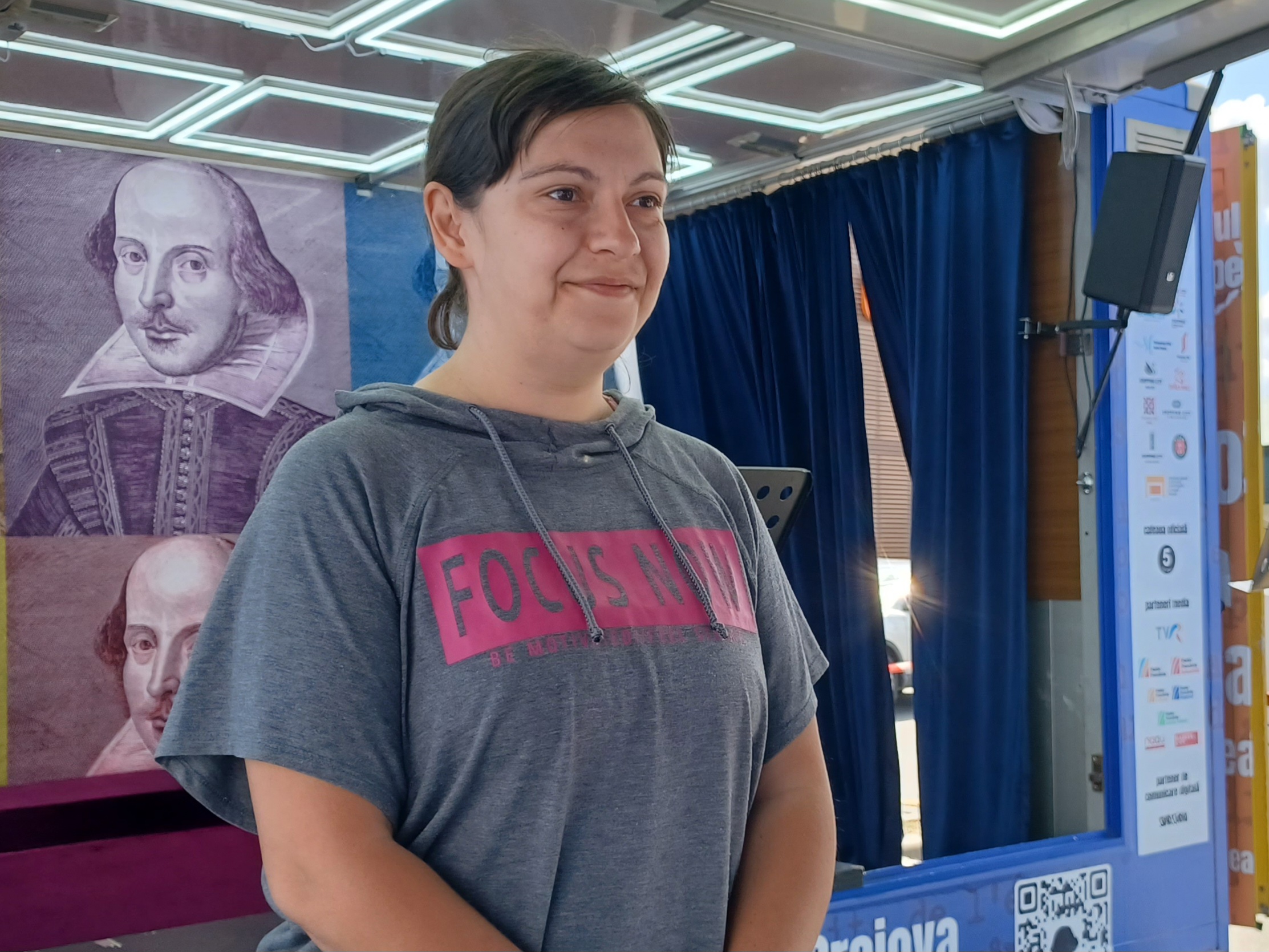„Caravana aduce creaţia lui Shakespeare, în principal, mai aproape de zonele care nu au acces ușor la ceea ce înseamnă cultură. Iată, sonetele lui Shakespeare au răsunat deja în câteva localități, în câteva orașe și comune, și a fost o experiență extraordinară. (…) Ne bucurăm tare mult că reușim să ne întâlnim cu oamenii într-un asemenea cadru. Cred că e foarte important ca teatrul să iasă din săli și să meargă spre oameni”, afirmă actriţa, pentru care una din reprezentanţii a venit cu o surpriză foarte plăcută.