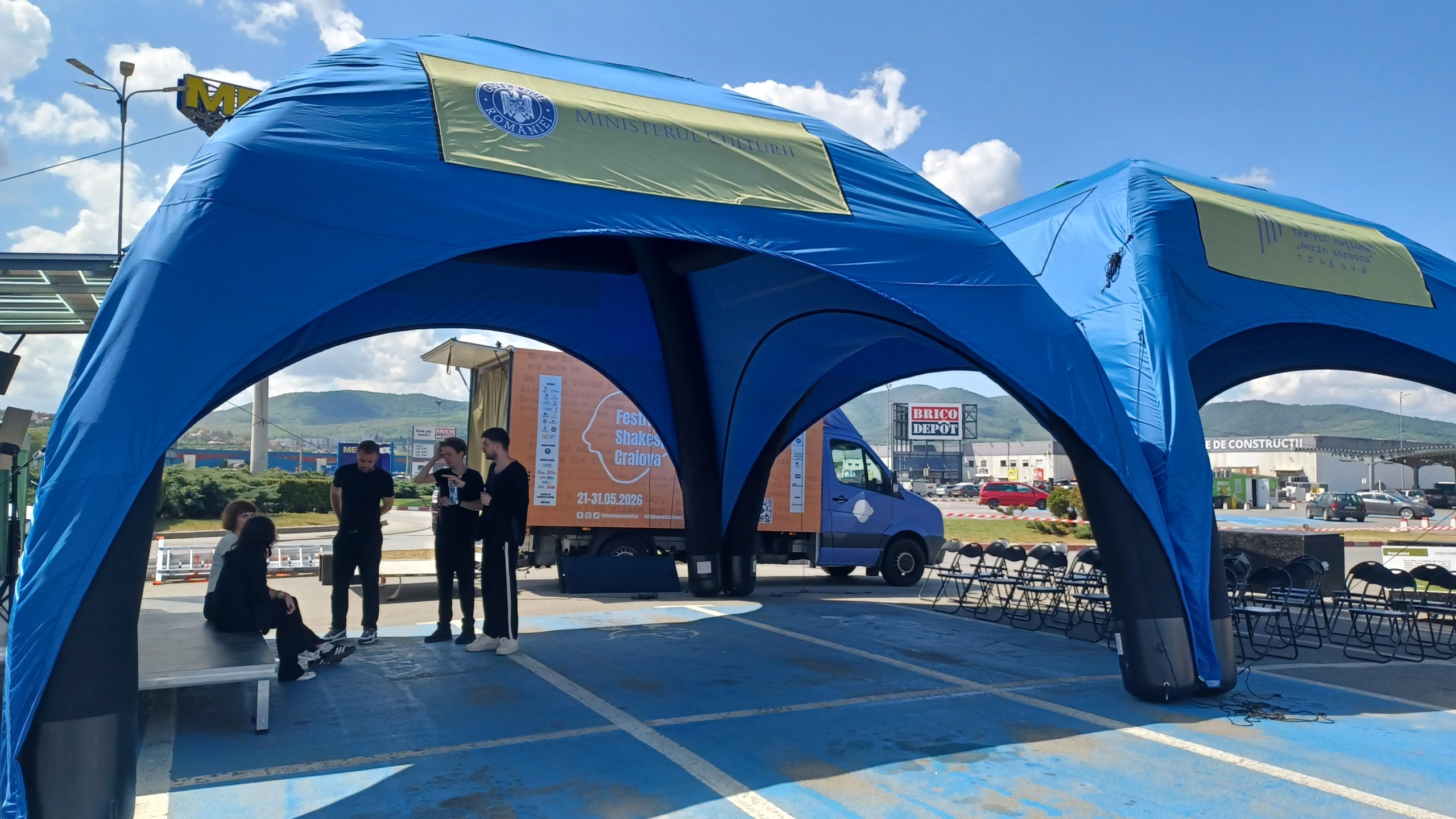 Caravana a fost prezentă luni după-amiază în parcarea unui centru comercial din Deva, iar marţi actorii au jucat în faţa oamenilor din comuna Pui.