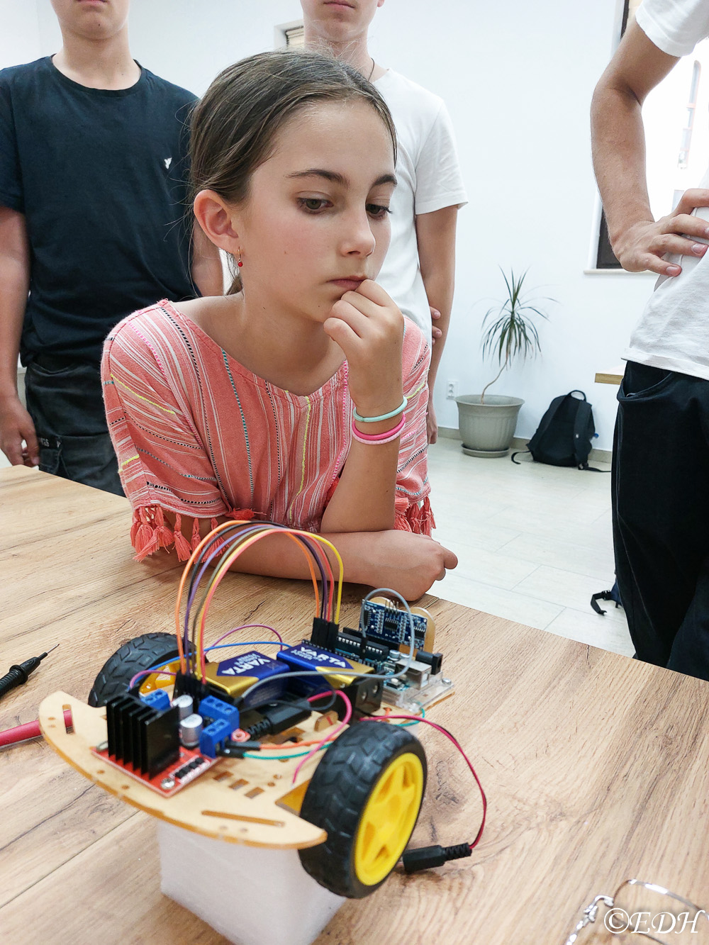 De asemenea, copiii au fost inițiați de către doamna dr. inginer Raluca Rob, care este și Șef de lucrări în cadrul Facultății de inginerie din Hunedoara, în domeniul roboticii și al folosirii electronicii, senzorilor, programării calculatoarelor și a altor dispozitive, în viața de zi cu zi.