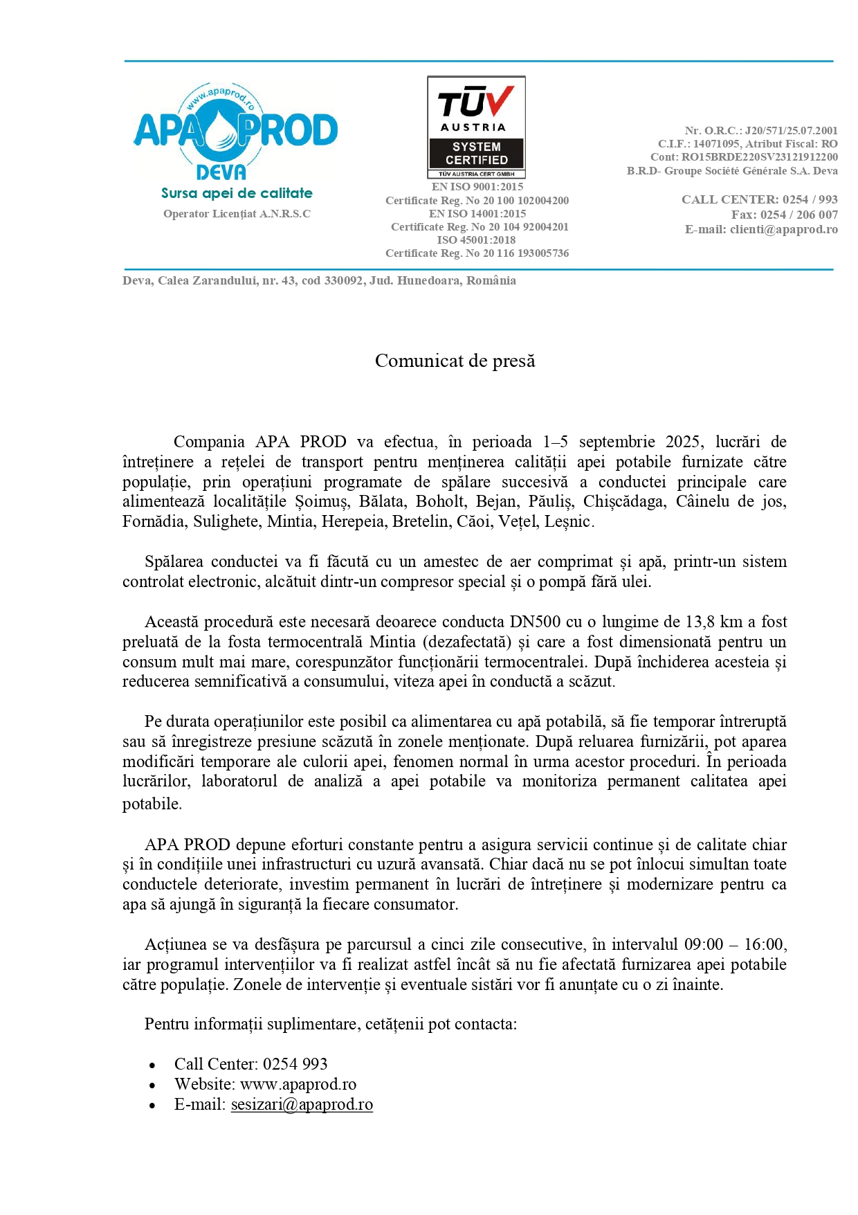 Comunicat de presă- Restricții de apă în zona centrală a județului
