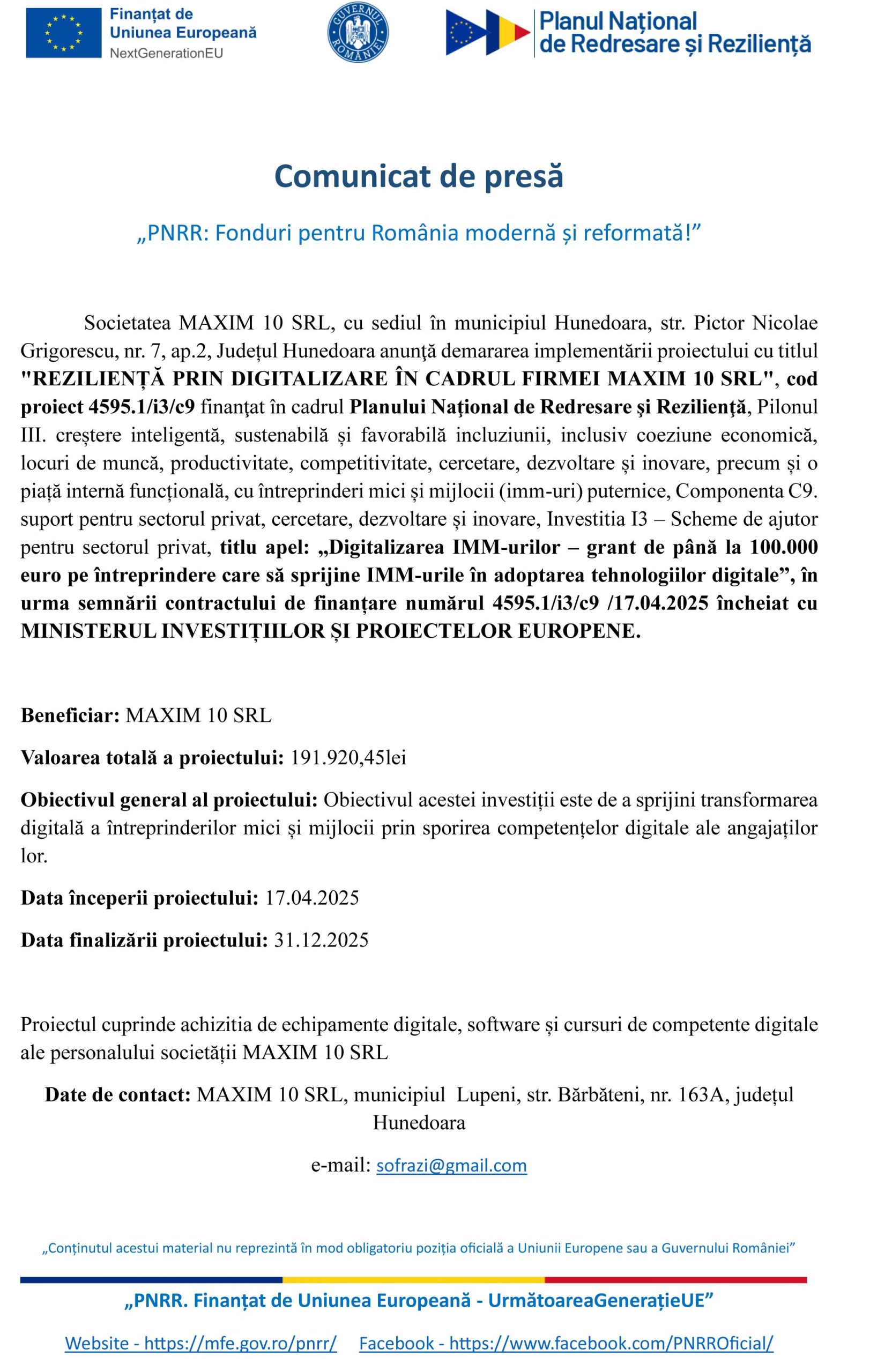 Comunicat de presă: „REZILIENȚĂ PRIN DIGITALIZARE ÎN CADRUL FIRMEI MAXIM 10 SRL”