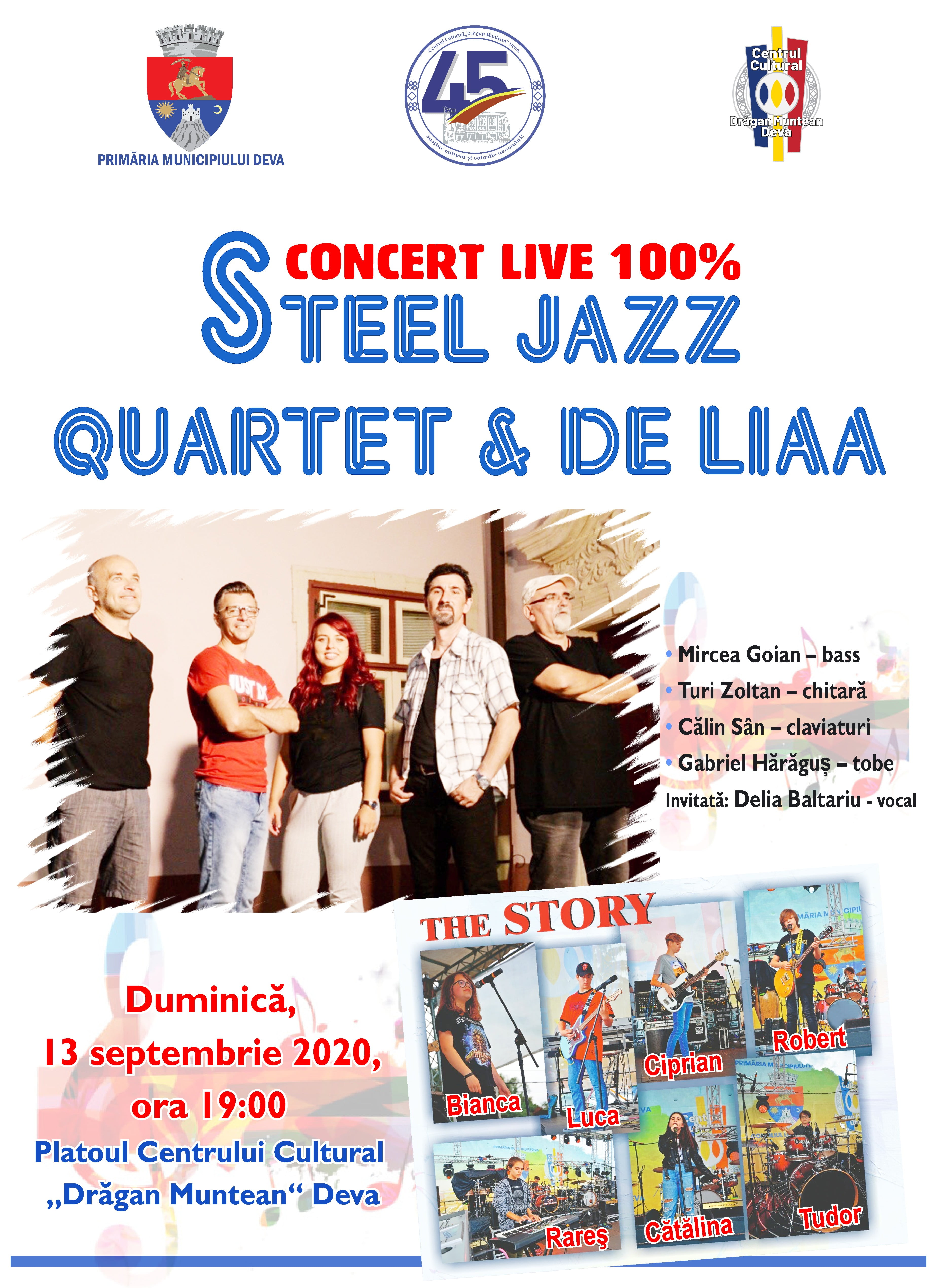 Primăria Municipiului Deva și Centrul Cultural ”Drăgan Muntean” vă invită, duminică, 13 septembrie 2020, la ora 19:00, pe platoul din fața Centrului Cultural din Deva, la un concert susținut de trupele ”The Story” și ”Steel Jazz Quartet”.