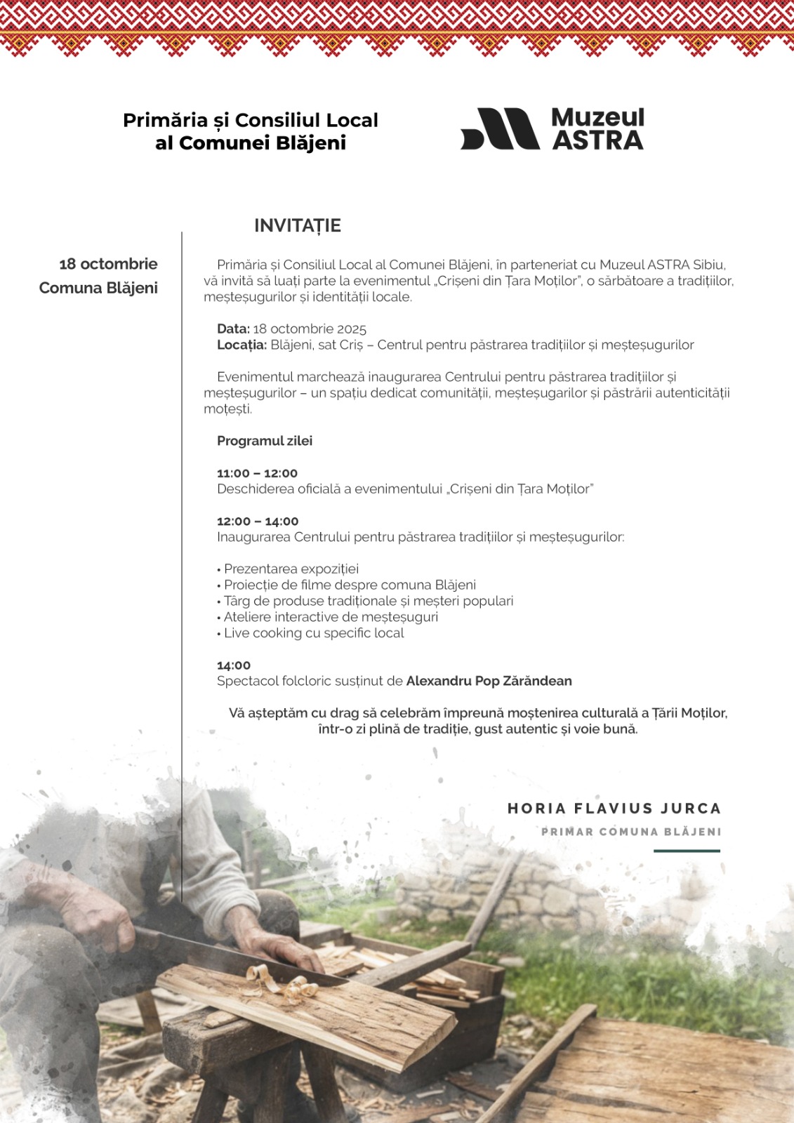 Primăria și Consiliul Local al Comunei Blăjeni, în parteneriat cu Muzeul ASTRA Sibiu, organizează sâmbătă, 18 octombrie 2025, evenimentul „Crișeni din Țara Moților”, o adevărată celebrare a meșteșugurilor, tradițiilor și autenticității moțești. Manifestarea va avea loc în satul Criș, la Centrul pentru păstrarea tradițiilor și meșteșugurilor, un spațiu nou dedicat comunității și promovării patrimoniului cultural local.