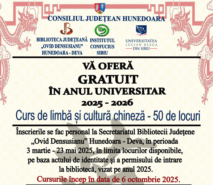 Biblioteca Județeană „Ovid Densusianu” Hunedoara – Deva anunță, pe această cale, organizarea în continuare a cursurilor gratuite de limbă și cultură chineză și în anul universitar 2025 – 2026.