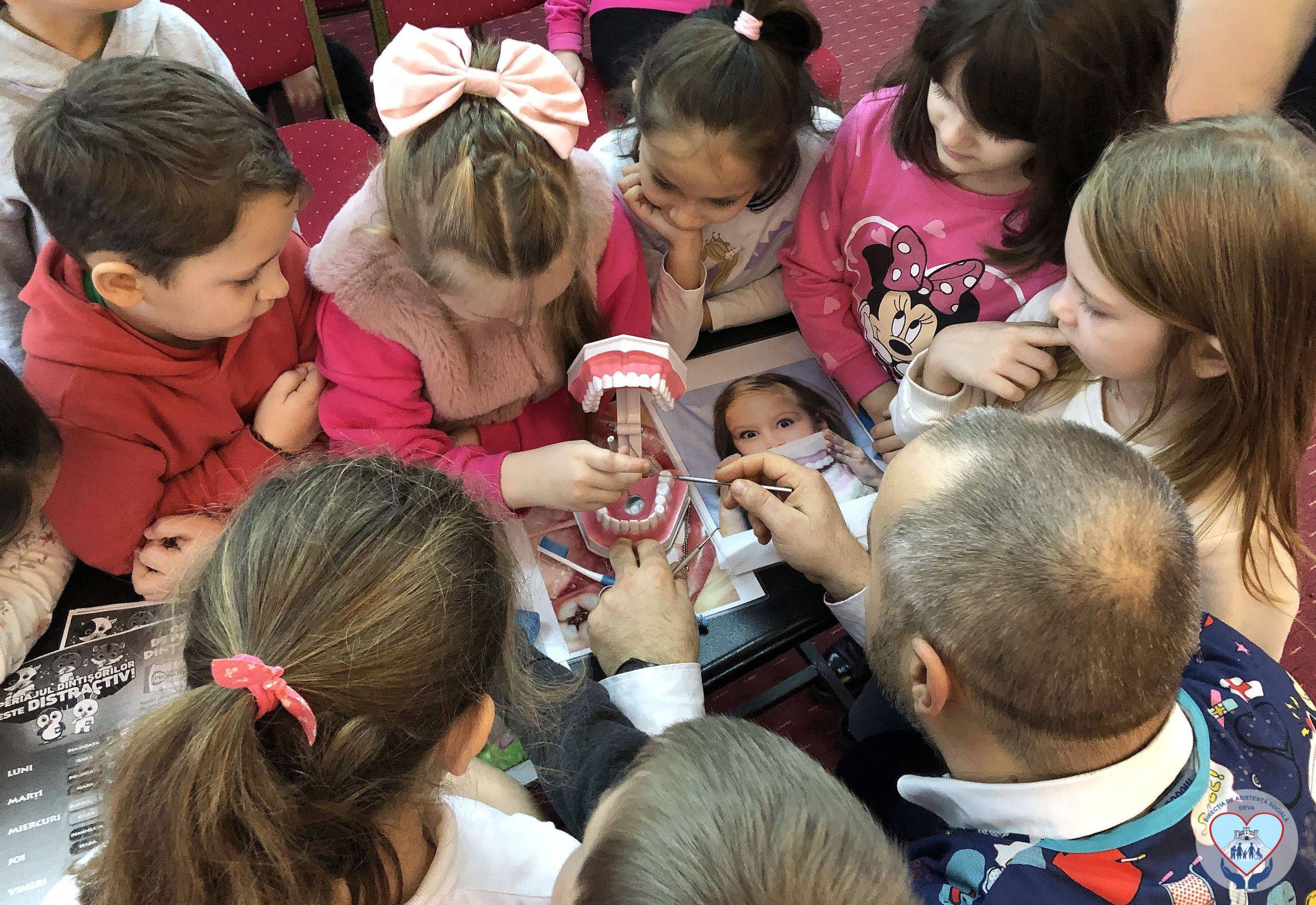 Spre încântarea elevilor, fiecare dintre ei a avut ocazia să se familiarizeze și să mânuiască instrumentele de bază folosite la o consultație stomatologică, iar cei mai curajoși au povestit cum și-au învins teama de dentist odată cu extracția primului dinte de lapte.