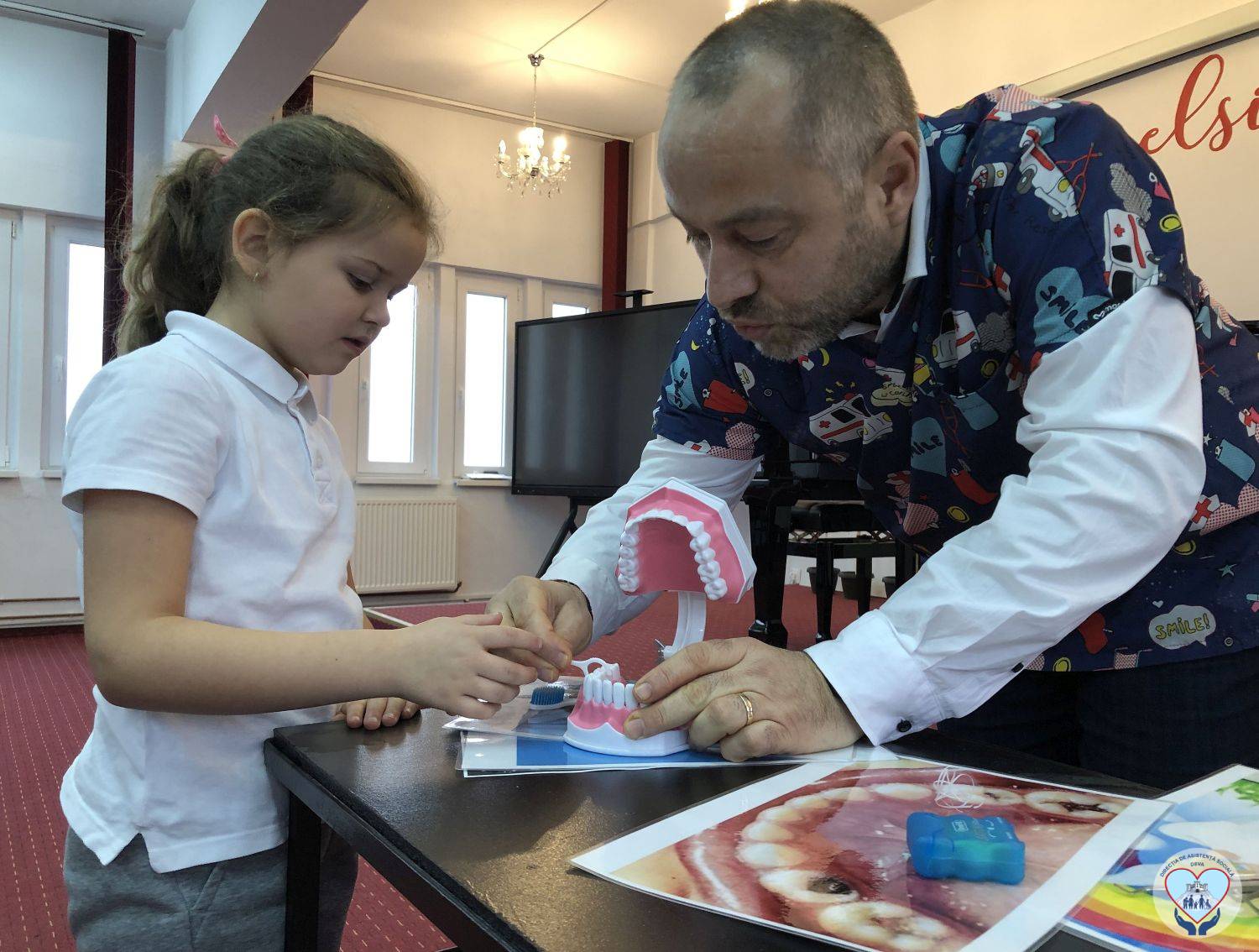 După ce, anul trecut, elevii au învățat principiile și beneficiile alimentației sănătoase, stomatologul școlii le-a explicat acum o serie de reguli ale igienei orale, care trebuie urmate chiar de la apariția primului dinte de lapte – pentru că îngrijirea preventivă joacă un rol important în menținerea sănătății dinților, iar cariile descoperite la timp sunt mai ușor de tratat.