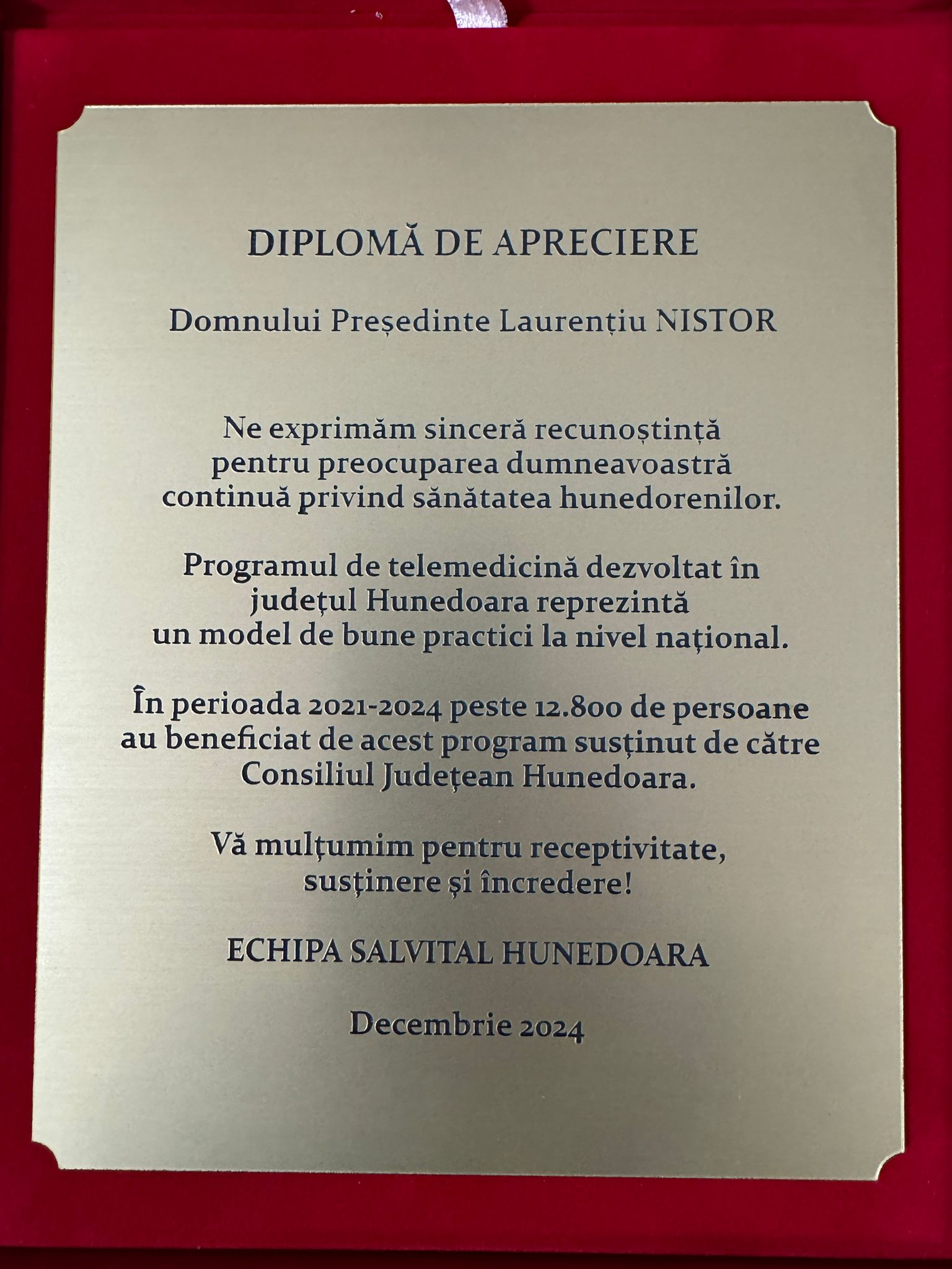 Am primit din partea președintelui Asociației Salvital, Petru Mărginean, o Diplomă de apreciere pentru susținerea Programului de Telemedicină și Teleconsultații în județul Hunedoara. Începând din anul 2021, prin acest program, locuitorii județului Hunedoara au acces la servicii medicale gratuite în cadrul caravanelor organizate de Salvital.
