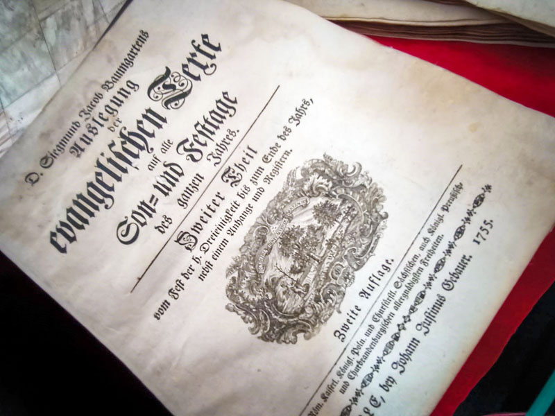 1. Siegmund Jacob Baumgartens, Auslegung der evangelischen Texte auf alle Son- und Festtage des ganzen Jahres; Erster Theil von Ersten Advent bis Trinitatis, Halle: bey Johann Justinus Gebauer, 1755, p. 249-656, in 4° — Ex-libris: „HUNYADMEGYEI TÖRT. ÉS. REG. TARSULAT KÖNYVTARA” (sigill.) – tuș violet, p. 521.
