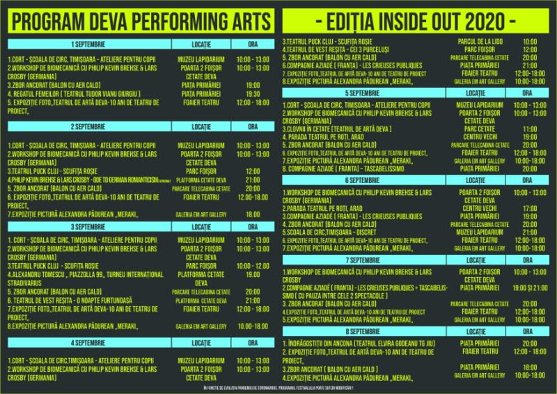 Programul detaliat (pe zile ,ore și locații ) va putea fi consultat pe site-ul www.teatruldeartadeva.ro și pe pagina de Facebook a instituției, începând cu data de 1 august 2020.