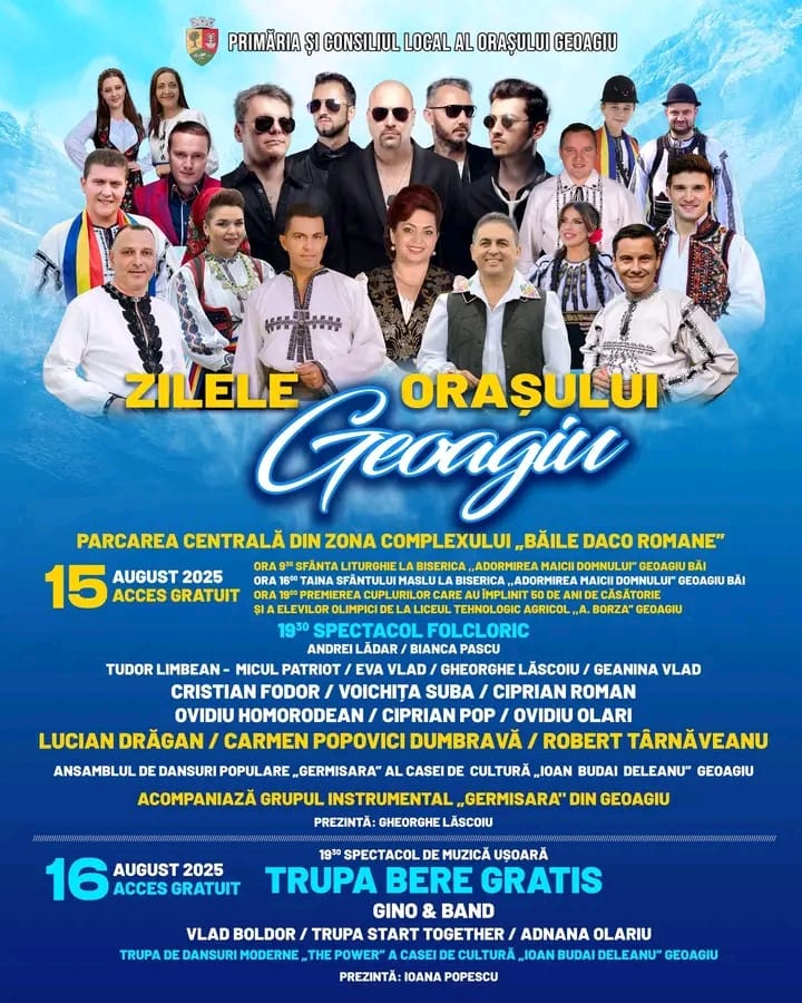 În perioada 15–16 august, locuitorii orașului Geoagiu și turiștii aflați în zonă sunt invitați să participe la Zilele Orașului Geoagiu 2025, un eveniment devenit deja tradiție, organizat de Primăria și Consiliul Local Geoagiu. Anul acesta, sărbătoarea promite două zile pline de emoție, recunoștință și distracție pentru toate vârstele.