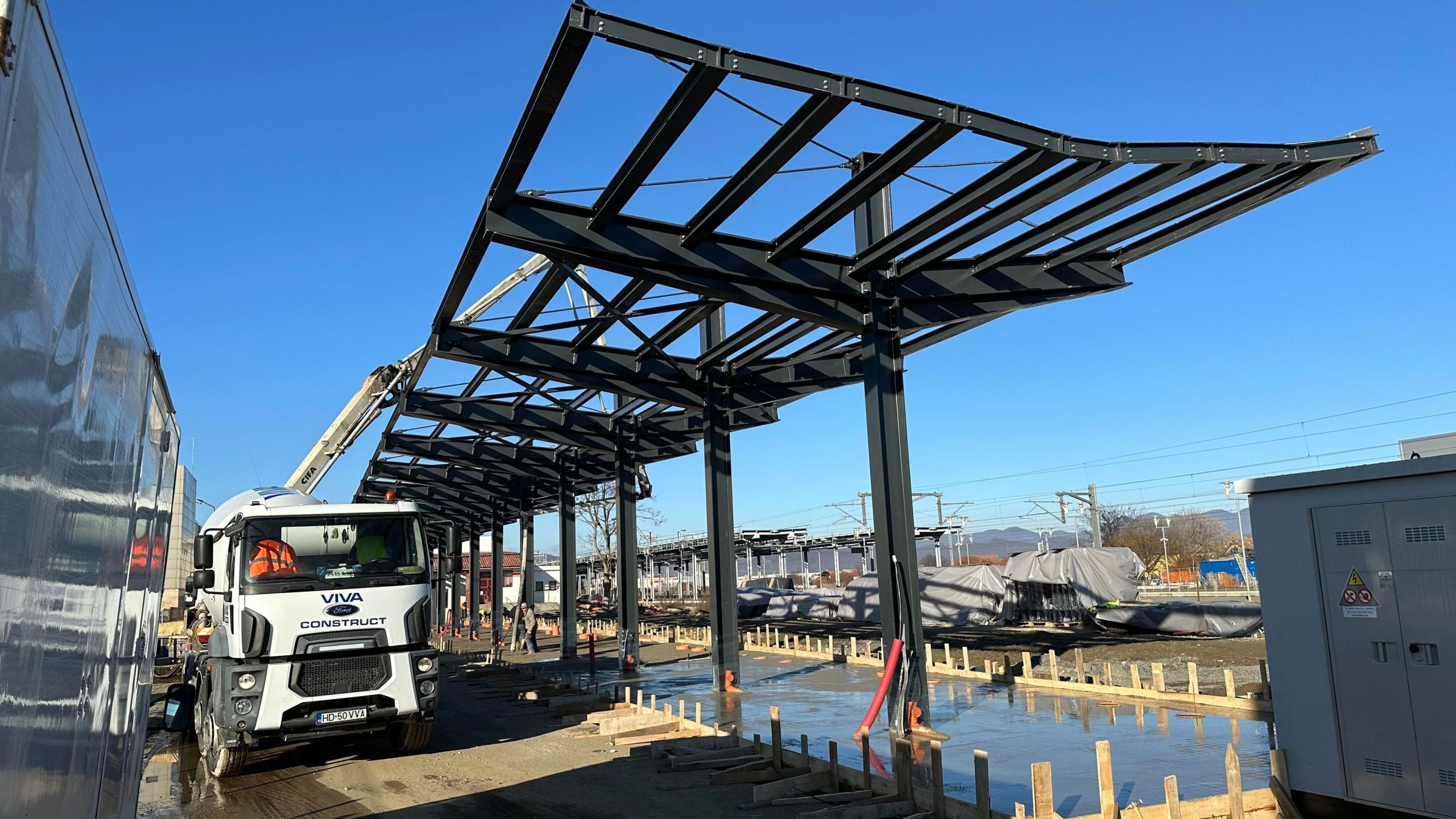 De asemenea, sunt în curs de execuție lucrările la stația de capăt din zona Gării. A fost ridicată structura și urmează montajul copertinei.