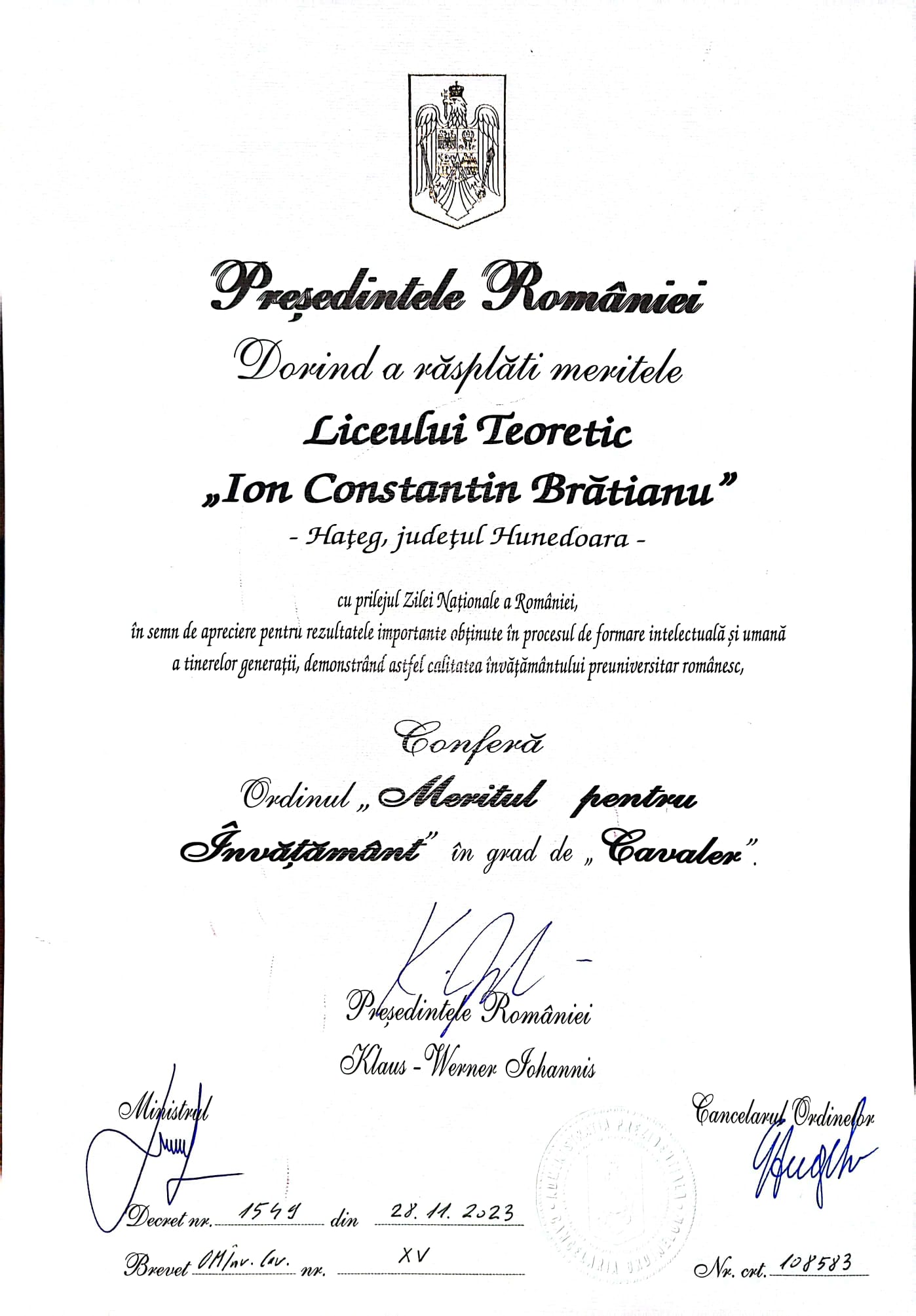 Cu prilejul Zilei Naționale a României,în cadrul unei ceremonii solemne, la Palatul Cotroceni a avut loc decernarea Ordinului „Meritul pentru Învăţământ” în grad de Cavaler, Liceului Teoretic ,,Ion Constantin Brătianu” Hațeg, în semn de apreciere pentru rezultatele importante obținute în procesul de formare intelectuală și umană a tinerei generații, demostrând astfel calitatea învățământului preuniversitar românesc.