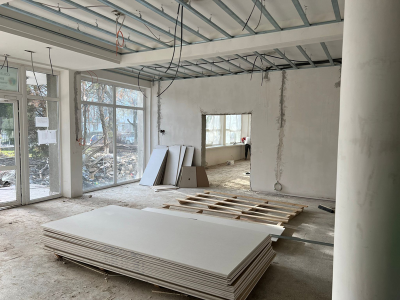 La clădirea în care va funcționa sala de sport a fost finalizată turnarea șapei și executarea izolației. În interior s-a aplicat gletul pe pereți și tavan.