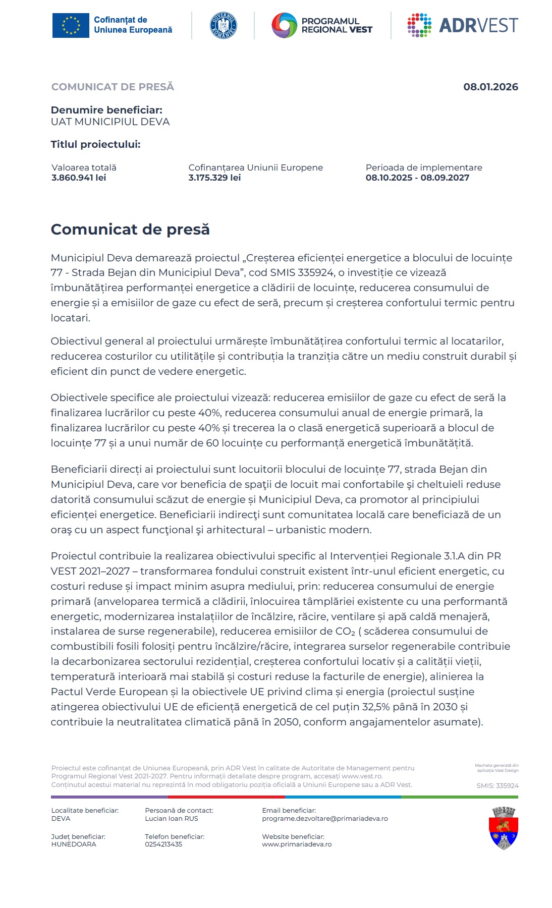 Municipiul Deva anunță demararea proiectului ”Creșterea eficienței energetice a blocului de locuințe 77- Strada Bejan din Municipiul Deva” cod SMIS 335924