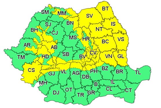 Administraţia Naţională de Meteorologie a emis, sâmbătă, o atenţionare Cod galben de ninsori şi viscol, valabilă până luni dimineaţa, în zone montane, la peste 1.700 de metri altitudine, respectiv o atenţionare Cod galben de intensificări ale vântului ce vizează judeţe din zona Moldovei, începând de duminică dimineaţa.