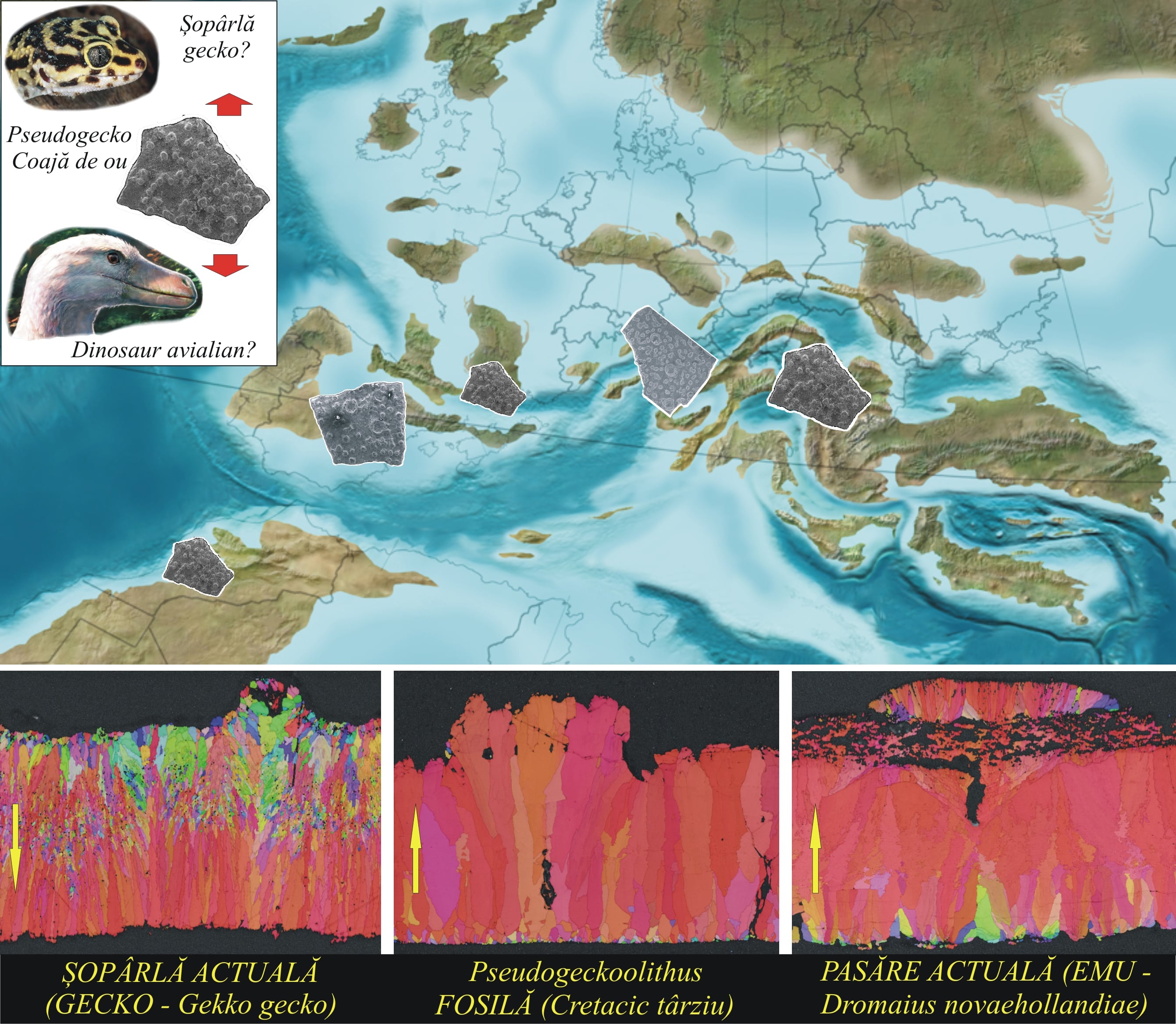 Foto 2: Răspândirea teritorială a cojilor de Pseudogeckoolithus, și analiza comparativă EBSD a acestora cu coji de ouăde gecko, respectiv pasăre