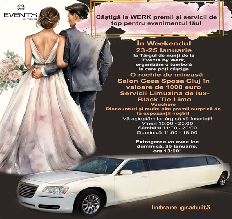 Unul dintre punctele de atracție ale târgului este tombola specială Events by Werk, deschisă tuturor vizitatorilor care se înscriu pe durata evenimentului. Premiile puse în joc sunt gândite să acopere unele dintre cele mai importante elemente ale unei nunți reușite, de la ținuta miresei până la transportul de lux.