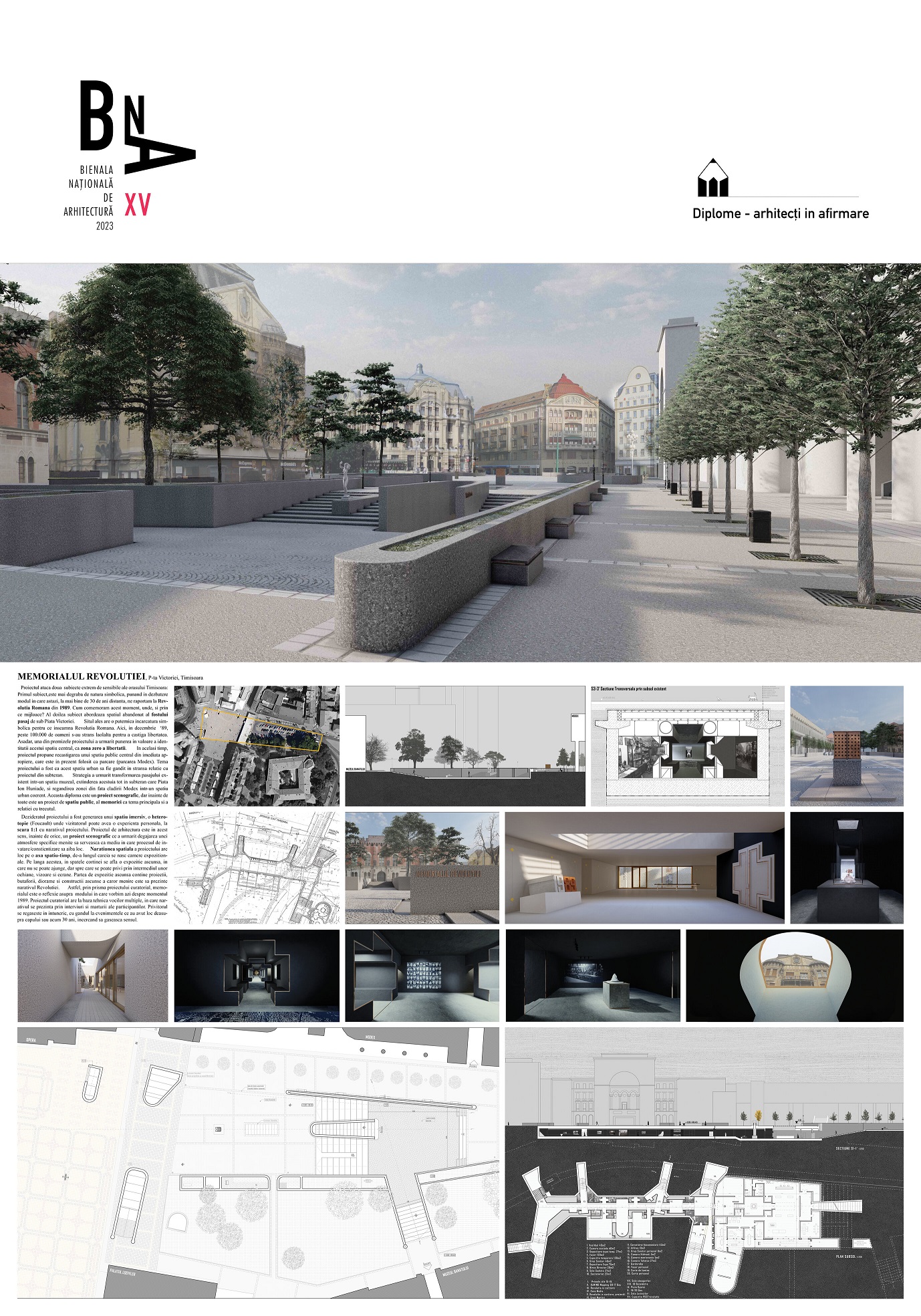 Secțiunea Diplome – Arhitecti în Afirmare a colectat un număr de peste 130 de diplome din toata țara, din care zece proiecte au obținut nominalizarea în finală. Dintre acestea, diploma absolventul FAUT Andrei Cîra, „Memorialul Revoluției”, coordonată de conf.dr.arh Cristian Blidariu, a obținut premiul 1 (ex aequo). Lucrarea abordează două aspecte cruciale referitoare la orașul Timișoara: semnificația Revoluției Române din 1989, modalitățile de comemorare a acestui moment istoric. Proiectul explorează în egală măsură și posibilitățile de revigorare a spațiului abandonat al fostului pasaj de sub Piața Victoriei. Diploma reflectă astfel un concept scenografic ce își propune revitalizarea unui spațiu public printr-o abordare ce este axată pe o relație sensibilă cu trecutul istoric celebrând astfel memoria colectivă a locului. Link: https://www.uar-bna.ro/2023/proiecte/57/
