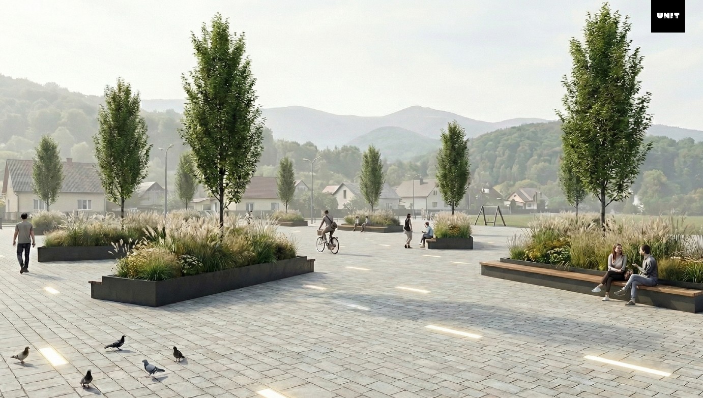 • Creșterea suprafețelor verzi și integrarea elementelor naturale pentru a transforma piața într-un loc plăcut, relaxant și prietenos cu mediul.