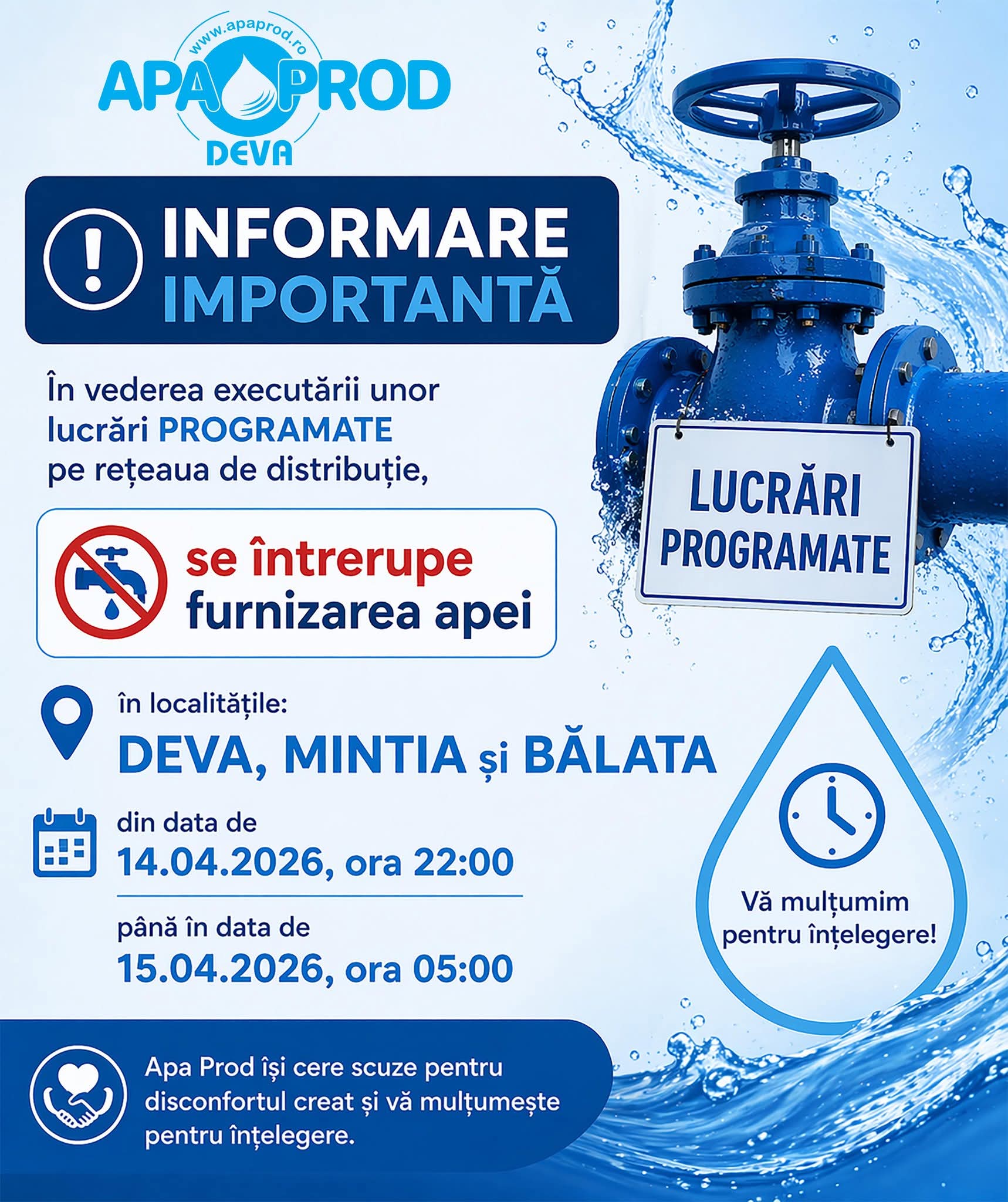 Se întrerupe furnizarea apei în DEVA, BĂLATA şi MINTIA