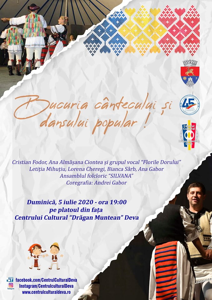Primăria Municipiului Deva şi Centrul Cultural „Drăgan Muntean” vă invită, duminică, 5 iulie 2020, la ora 19:00, pe platoul din faţa Centrului Cultural din Deva, la un spectacol de folclor desfăşurat sub genericul „Bucuria cântecului şi dansului popular!”.